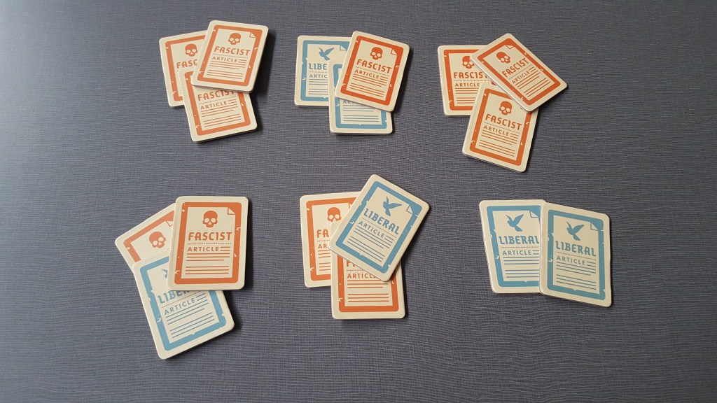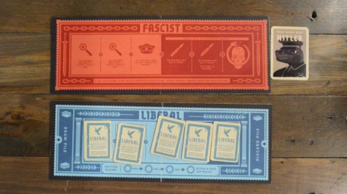 The game has two boards, a Liberal and Fascist board. Each party is trying to pass enough policies to complete their board. While the Liberal board has no special powers, once enough Fascist policies have been played, whoever is the current President is granted a power such as being able to see someone’s secret loyalty card. The Liberals can win by either filling their board with 5 Liberal policies or by assassinating Hitler. The Fascists can also win by filling their board, but if Hitler is elected as Chancellor after three Fascist policies have been put into play, the Fascists win.