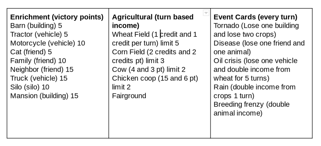 My partner and I prototyped a game I have named “Farmily Feud.” The game’s core mechanism is building as it is each player’s goal to build the biggest farm. Other mechanisms used include income and dice roll.
