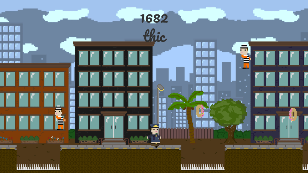 To play, the player (seen above) simply uses a A and D to run back and forth and SPACE to jump. They gain points by collecting donuts and coffee and gaining distance. They have to avoid obstacles (spikes, jumping bad guys) and coffee and donuts affect the weight and speed of the player can move.